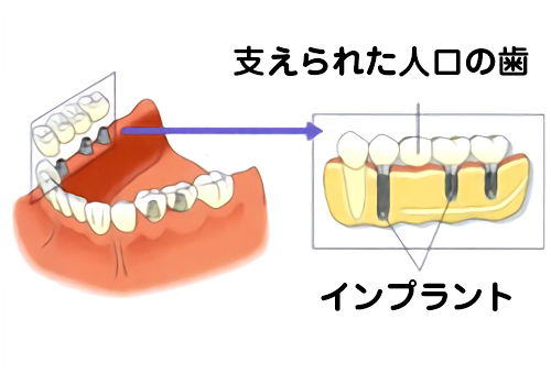 インプラントとは、失ってしまった天然歯の代わりに、人工の歯根を顎の骨に埋め込み、その上に人工の歯を装着する治療法です。